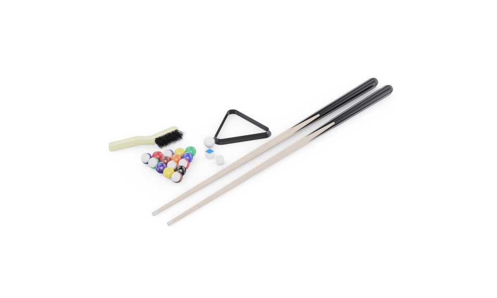В набор входят: 2 футбольных мячика, 2 теннисные ракетки, 2 мяча для настольного тенниса, комплект бильярдных шаров, треугольник для их выравнивания, 2 кия, щетка для ухода за покрытием и 2 мелка. Всё необходимое для начала игры — уже в комплекте!
