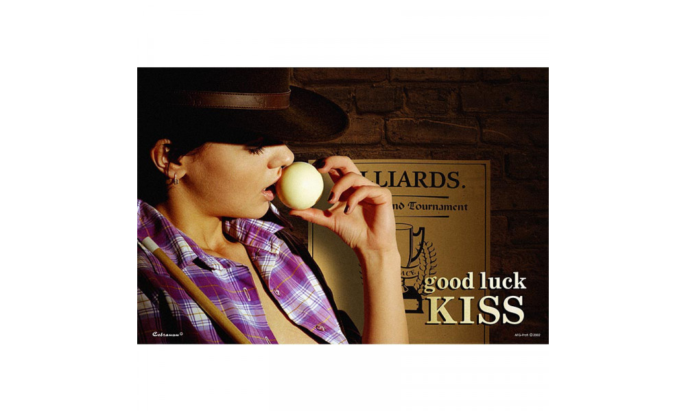 Цветной постер бильярдной тематики. Идельный фотоснимок с универсальной идеей. Девушки, предпочитающие независимость и уверенные в себе причислят героиню к харизматичным эмансипированным особам, обладающим собственным счастливым талисманом - бильярдным шаром. Мужчины же, в свою очередь, воспримут этот постер как послание удачи от прекрасной романтичной незнакомки, сопровождающей своего героя на турниры по бильярду.
